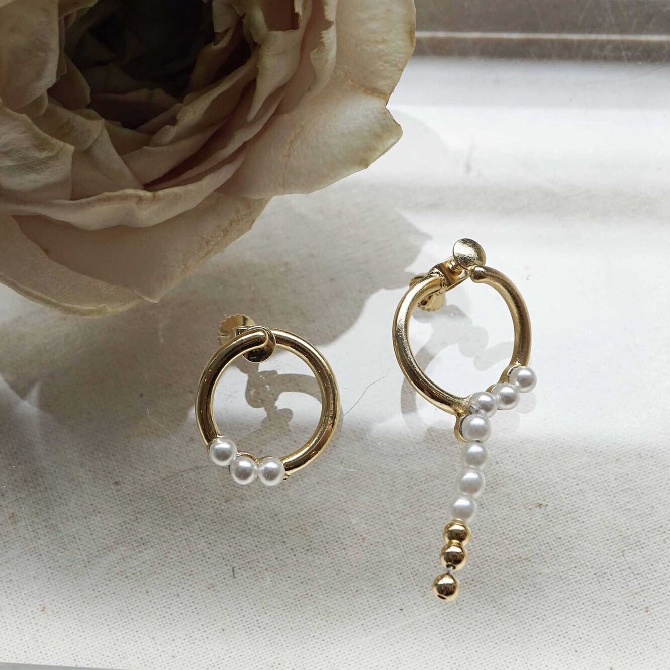 アシンメトリーデザインのパールイヤリングです。 キレイめ、カジュアルどちらにも合うアイテムです。 □ミニ巾着が付属します 【サイズ】約 4.0 cm / 約 2.0 cm 【素材】真鍮